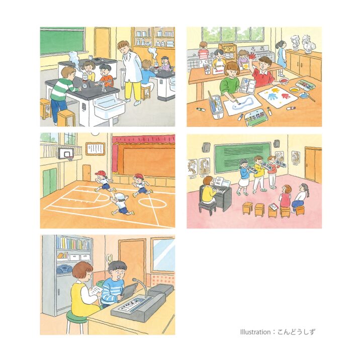 小学校の教室の様子や、各教科の先生、図工室、体育館、音楽室、放送室、理科室を描きました。