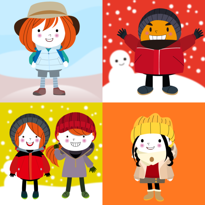 色とりどりの冬服に身を包んだ子どもたちが、雪遊びやお出かけを楽しむ様子を描いたイラスト集です。温かい帽子やコート、マフラーなど季節感あふれる装いと、それぞれの表情豊かなキャラクターたちが、冬の楽しさやワクワク感を伝えています。ポップでやさしいタッチのデザインが親しみやすい雰囲気を演出しています。