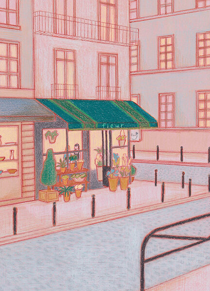 オリジナル作品「生花店」。パステルと色鉛筆で描いています。