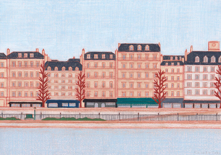 落ち着いた色味と広い面で、心地の良い空間を描きます。パステルや色鉛筆を用いたマットな質感で、ヨーロッパの街並みや室内の情景、人物などを描いています。アナログでの制作がメインではありますが、デジタルツールを使用して描くこともあります。