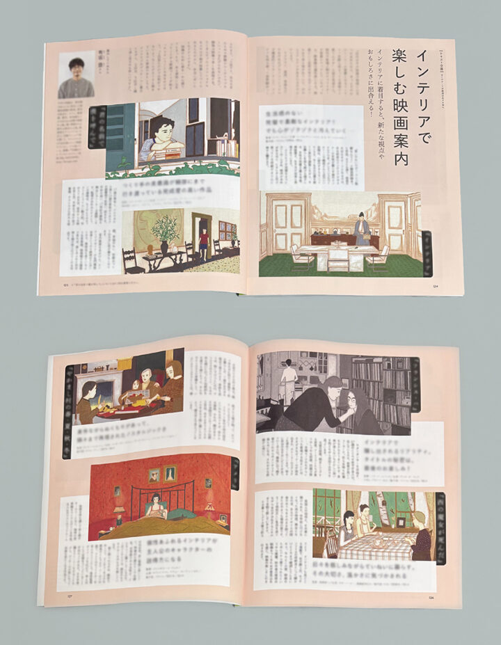 NHK出版より1/16刊行のムック『心おどる あの人のインテリア』で、移動映画館「キノ・イグルー」を運営されている有坂塁さんがご紹介する、「インテリアで楽しむ映画案内」のイラストレーションを担当しました。インテリアが特徴的な以下6つの映画のシーンを描いています。