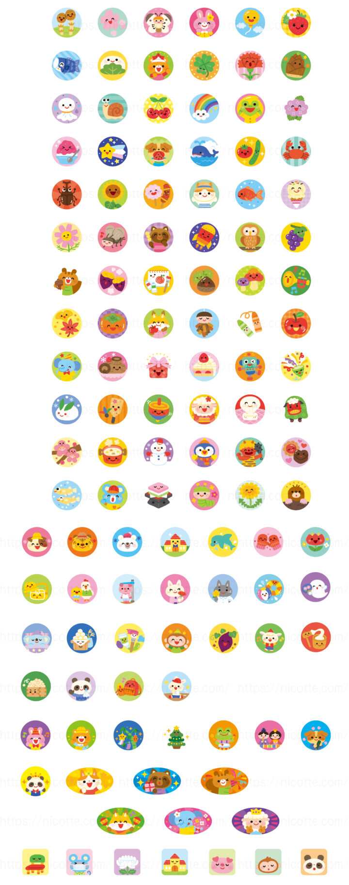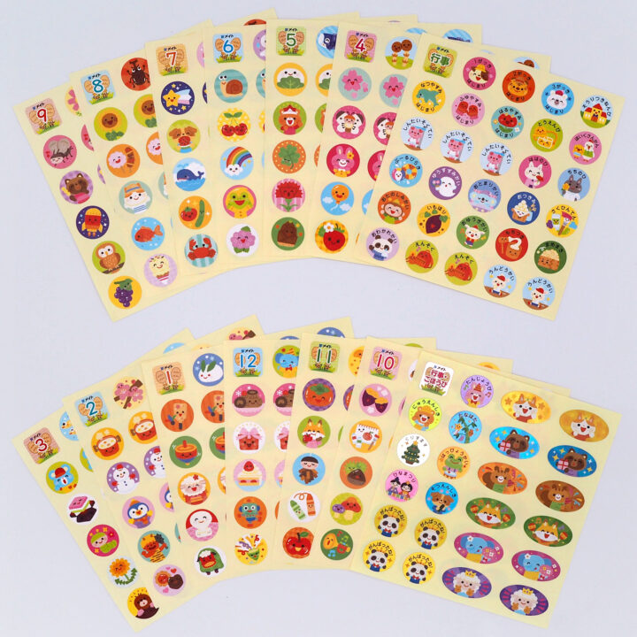 しゅっせきシールは、4月〜翌3月各6種と、行事、ごほうび、お休みのイラストを制作しました。