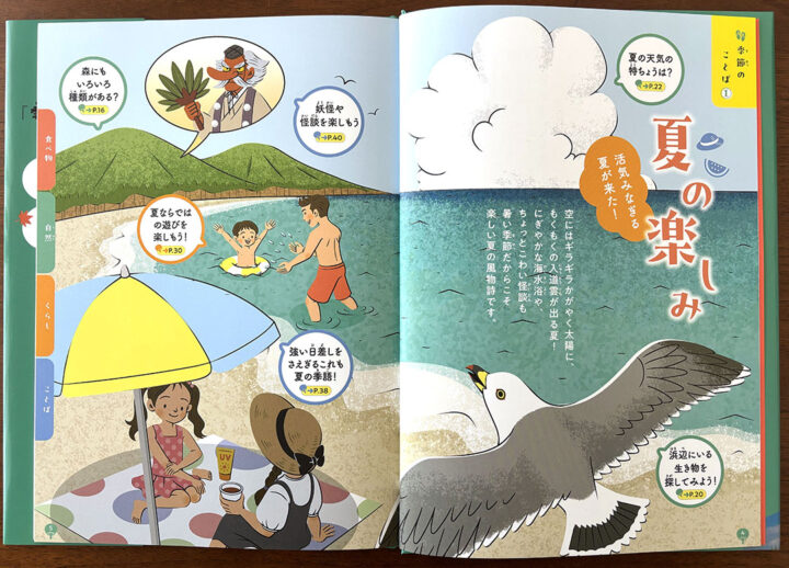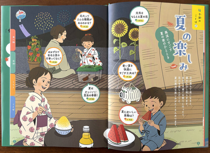 様々な夏の行事や食事、植物、キャラクターなどなど、沢山のカットを描きました。