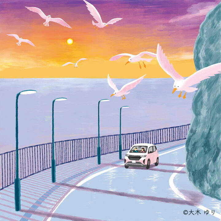 こちらの挿絵は、琵琶湖大橋を車から覗いて見ているジローです。