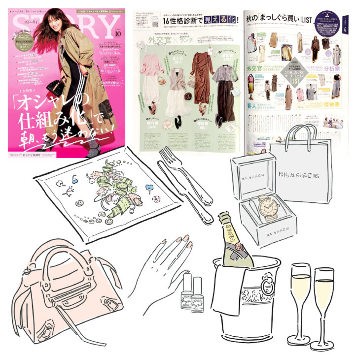 光文社社様のファッション誌「STORY 10月号」で、特集記事「16性格診断で見える!秋のまっしぐら買いLIST」内で、イラストを制作させていただきました。