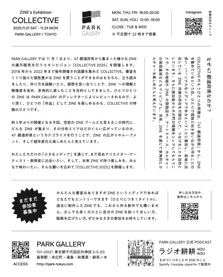 11月1日から、東京・PARK GALLERYさんで開催されるZINEイベント『COLLECTIVE 2025』に参加します!