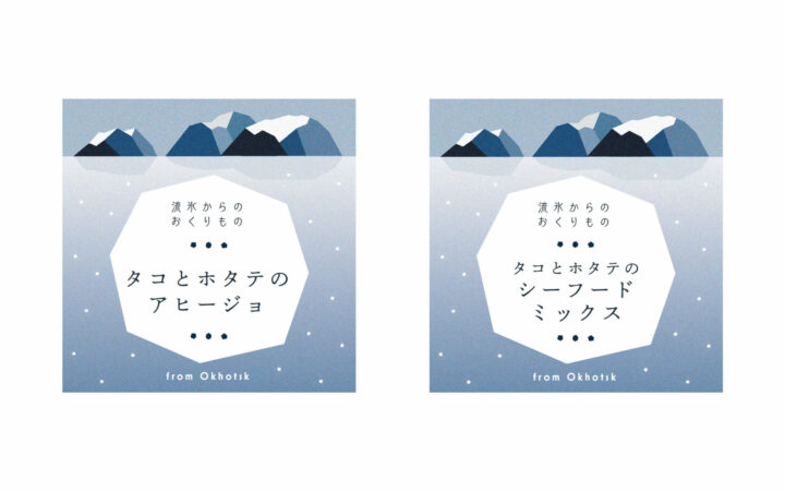 マルホ阿部水産さまの新ブランド「流氷からのおくりもの」のラベルデザインを担当しました。オホーツク海では流氷の中に閉じ込められているプランクトンが、春になって海の中に溶け出し、魚たちの良い餌になるそうです。オホーツク海の魚介類がおいしい秘訣は流氷にあるとのことで、流氷をモチーフにラベルをデザインしました。