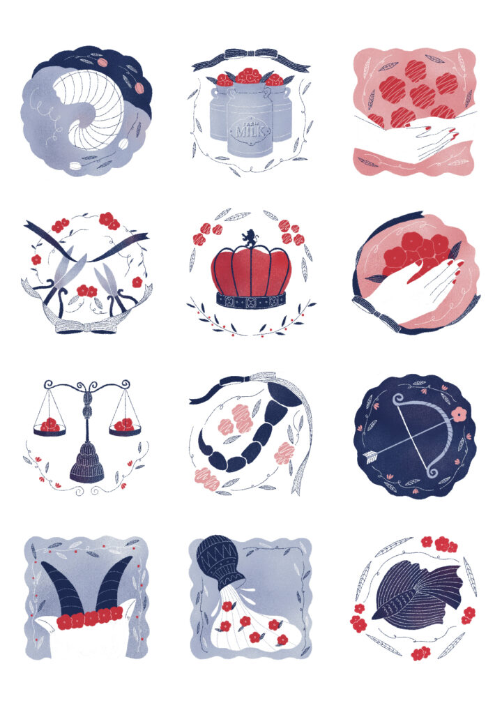 ハースト婦人画報社の「25ans(ヴァンサンカン)」2023年8月号の2023年下半期占い特集のイラストレーション13点を担当しました。モノや動物や人の部位で星座を表現するというお題をいただき制作しました。
