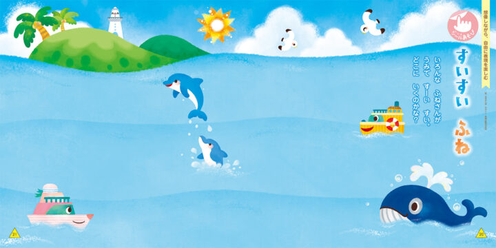 夏の海がテーマということで、ページいっぱいに広がる青い海と空を描きながら、「どんなふねくんがいたら、こどもたちが楽しく遊べるかな〜?」と想像をふくらませて制作しました。