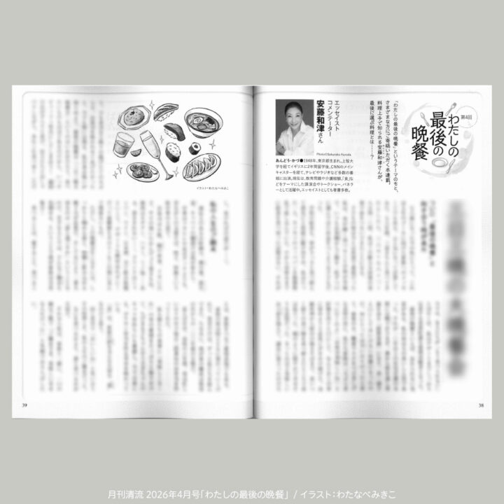 月刊「清流」の連載「わたしの最後の晩餐」挿絵を担当しています。