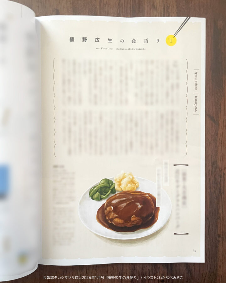高島屋ゴールドカード会員向け会報誌「Takashimaya Salon(タカシマヤサロン)」、元dancyu編集長 植野広生さんの連載コラムで挿絵を担当させていただきます。第一回目となる2026年1月号ではデミグラスハンバーグを描きました。