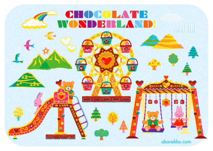 11階「CHOCOLATE WONDERLAND!」のページの、観覧車などの遊具や鳥、木、山、雲などのイラストを描かせていただいています。