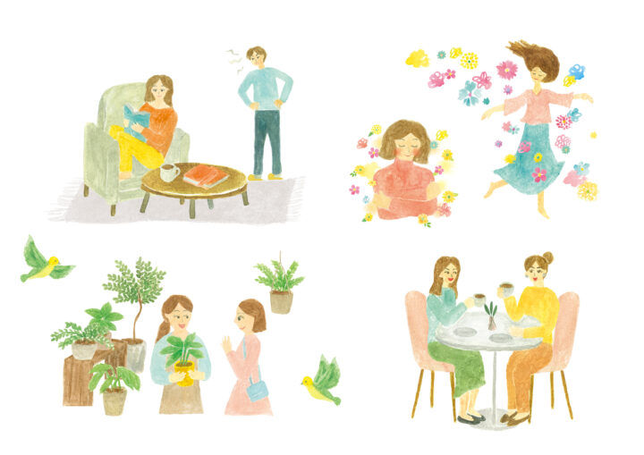 人付き合いで楽しんでいる人や悩んでいる人物イラストを描きました。