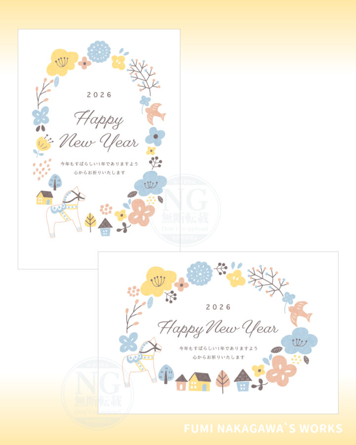 北欧風の植物と干支の馬を掛け合わせた可愛くておしゃれな年賀状に仕上がっています。