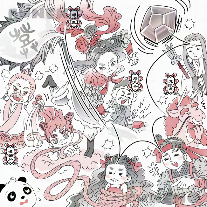鄧嬋玉が五光石をぶん投げる&土行孫が梱仙縄で西岐メンバーを翻弄するシーンを描きました。