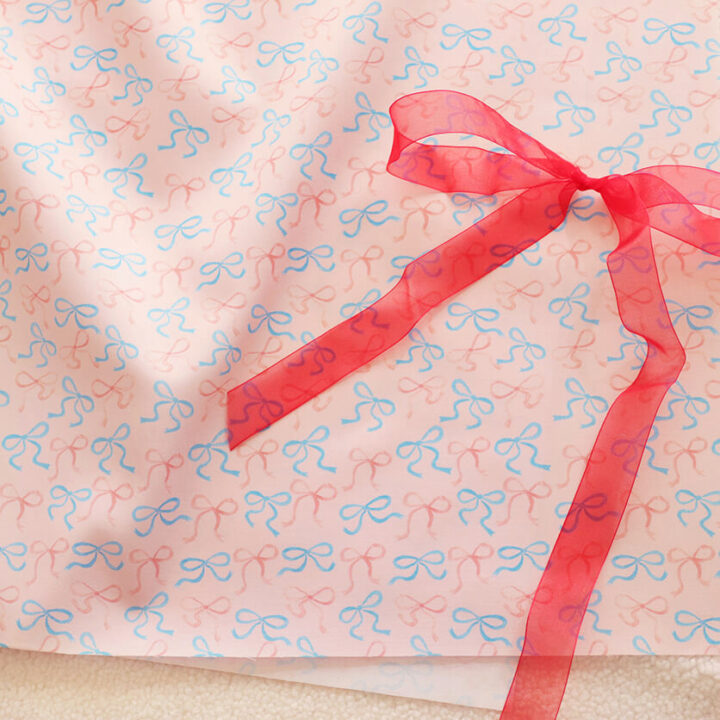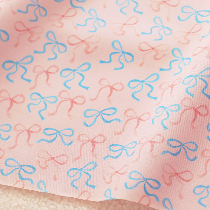 ふんわりと舞うような水色とピンクのリボンが、生地いっぱいにリズム良く描かれています。