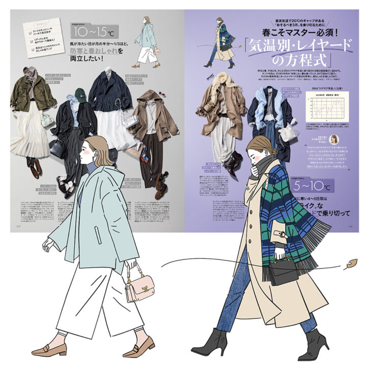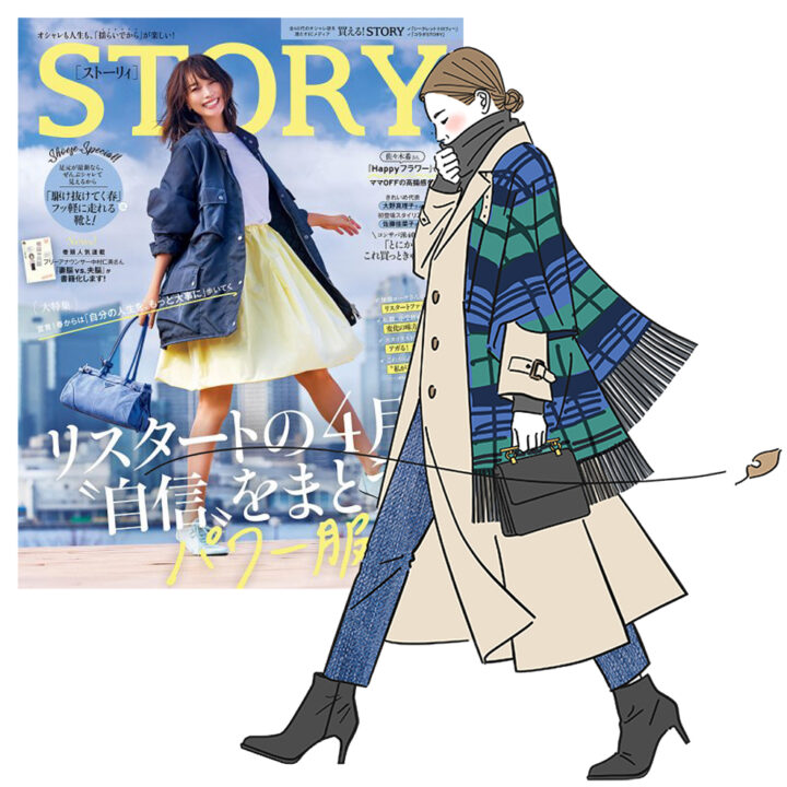 光文社様「STORY」4月号特集記事内「春こそマスター必須!気温別レイヤードの方程式」の女性イラストを制作させていただきました。