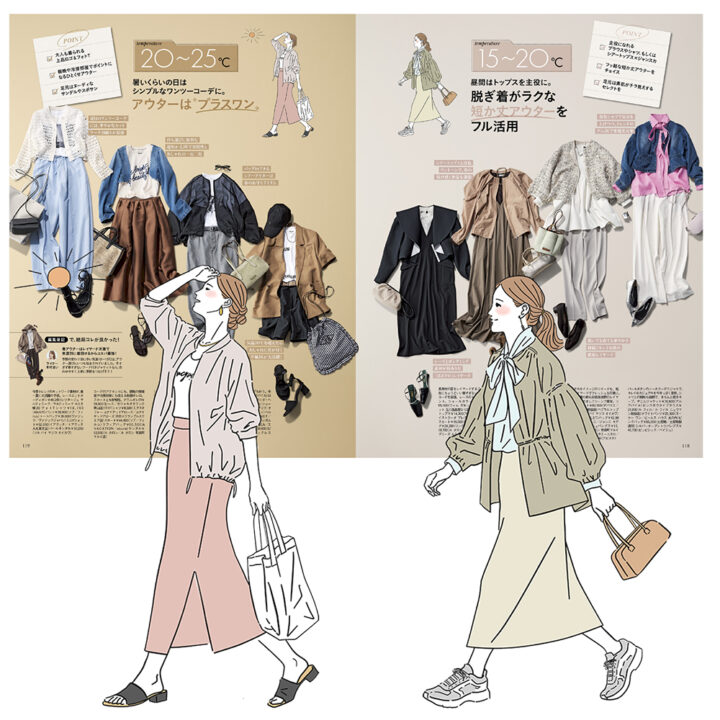 編集様からは各気温別にアイテム例をいただきましたが、それを参考にしながら基本的にこちらでご提案させていただき、ほぼ修正なくご納品できました。