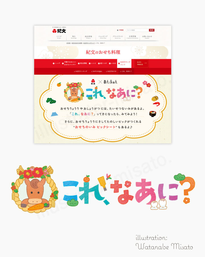 紀文様とあんふぁん様のコラボ「これ、なあに?」のお正月用POPのタイトルイラストとおせち料理のイラストを担当させていただきました。