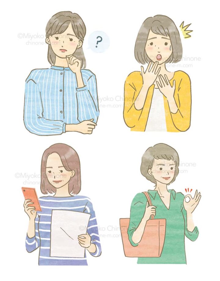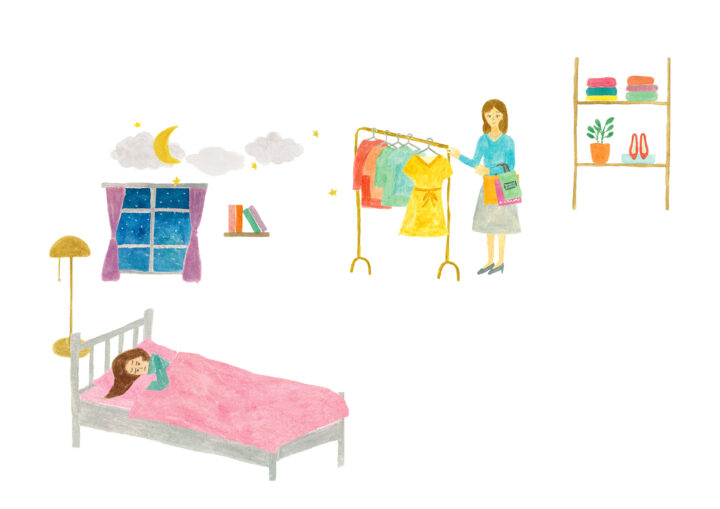 緊張で夜が眠れない、ショッピング中に悩んでる女性を描きました。
