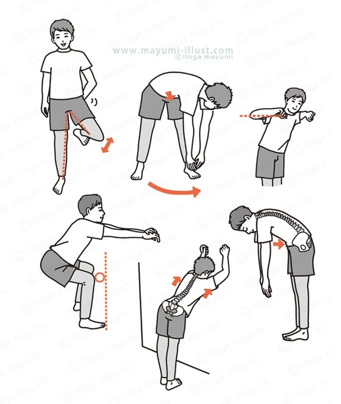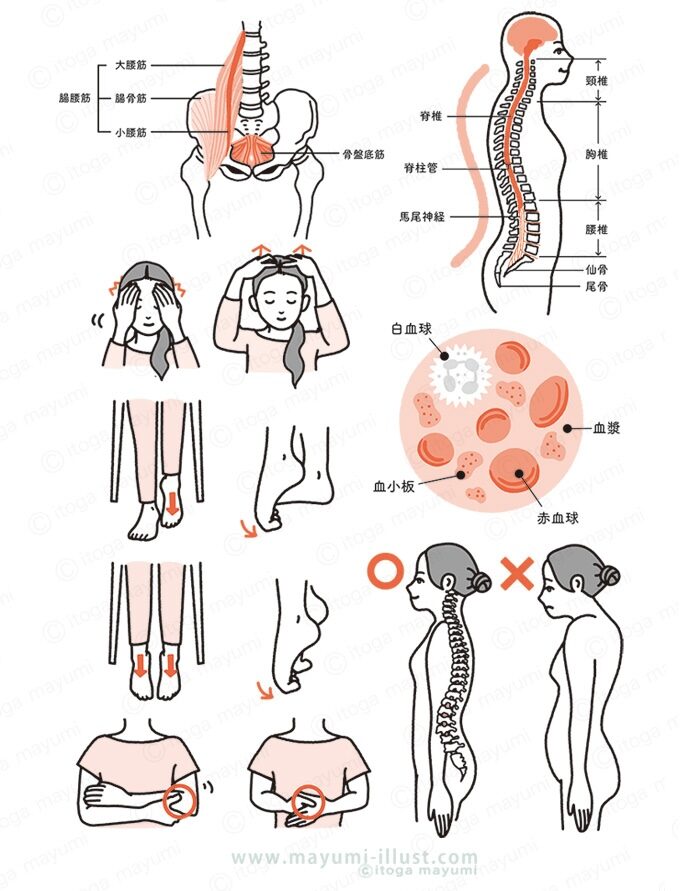 ストレッチやマッサージをしている女性&男性、背骨や筋肉など