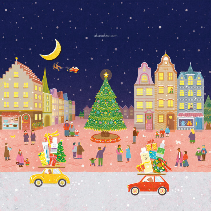 パッケージにはAnuaの製品とプレゼントを載せた車、背景にはその車が走っているクリスマスの夜の街を描いています。ご納品した背景イラストをジオラマのように組み立ててくださり、パッケージの世界観を演出していただいています。