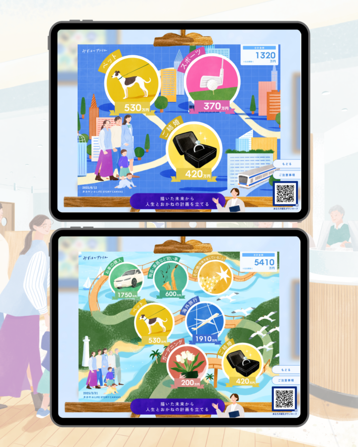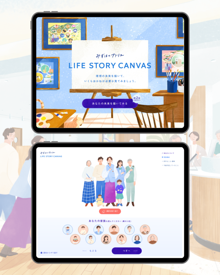 みずほ銀行様の新業態「みずほのアトリエ」オープンにあたり、キービジュアルと、店舗内でのメインサービスとなるシミュレーションコンテンツ用のイラストレーションを担当させていただきました。