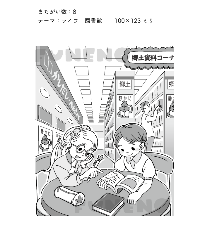 図書館というオーダーだったので、郷土資料のコーナーで調べ物をしているキッズを描きました。