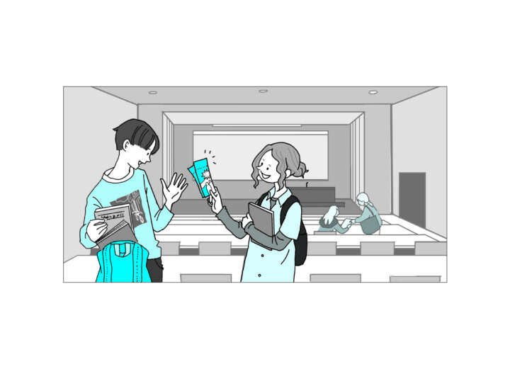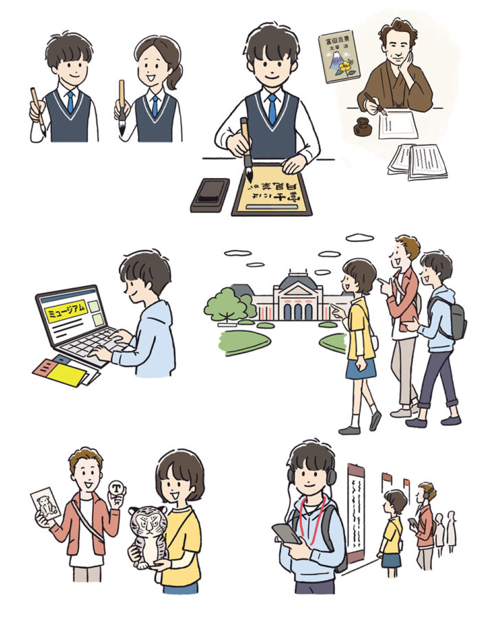 書道に親しむ生徒たちの様子や、鑑賞・体験シーンなどをやわらかなタッチで描いています。