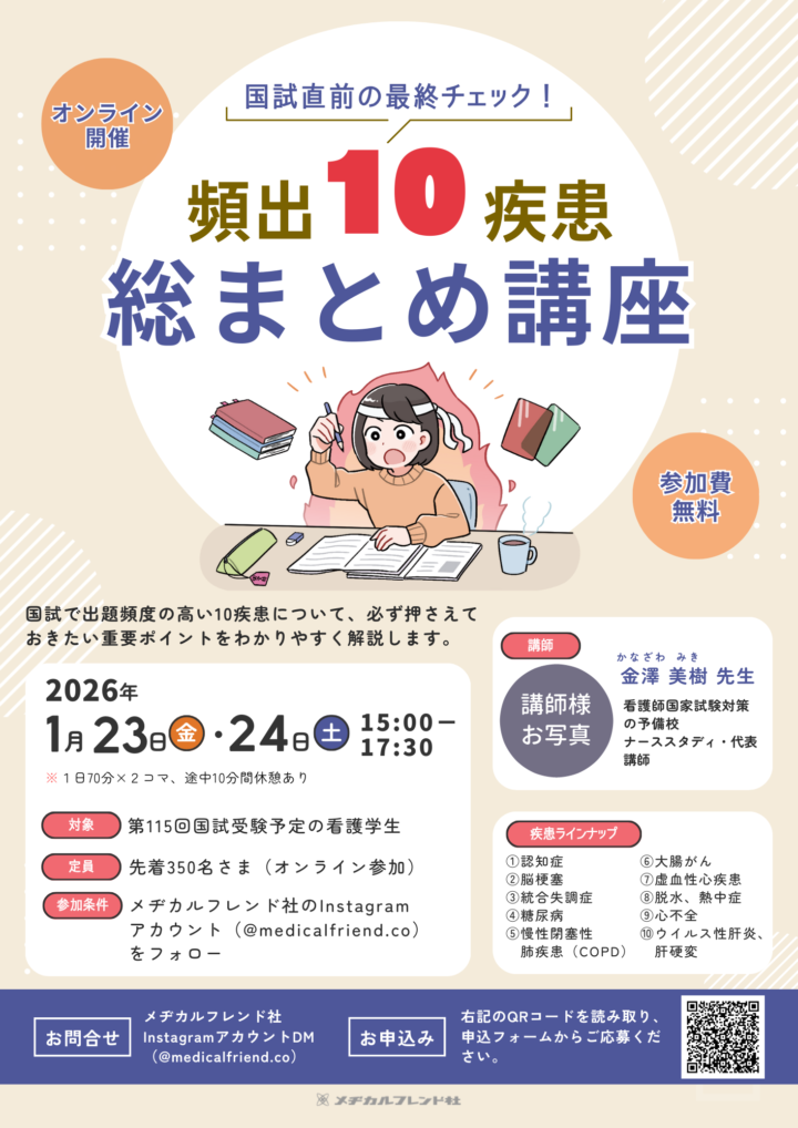 株式会社メヂカルフレンド社さまのご依頼で、看護学生向け「国家試験対策講座」の告知チラシ用イラストを担当しました。