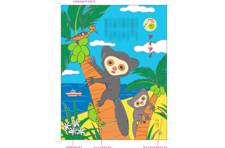 アイアイはマダガスカル島に生息するサルです。からだは黒く、目が丸くて大きく、爪はとても長く、そのまま描くと少し怖い雰囲気になってしまいます。