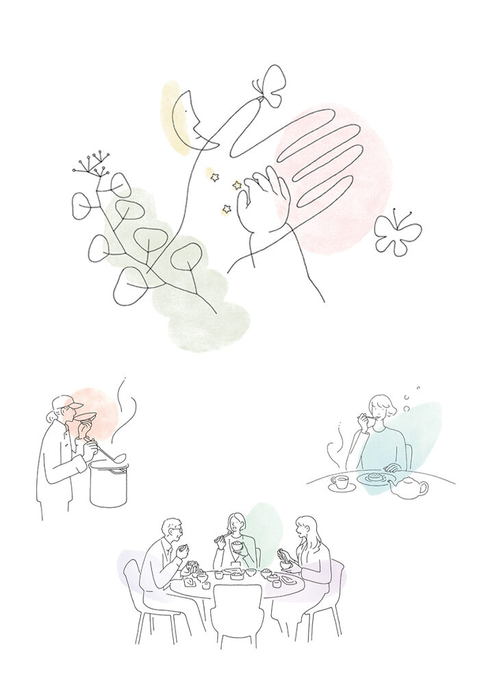 カットイラスト(7種)は、色数を少なめにしつつも温かい雰囲気を出せるように工夫しました。