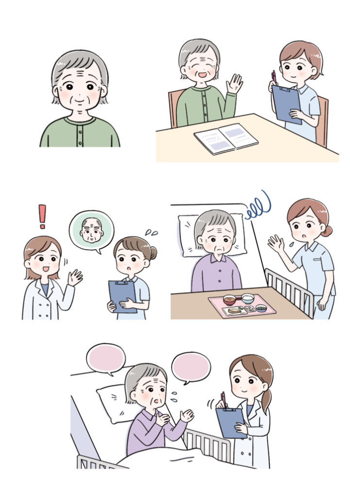 看護師と患者さんのコミュニケーションの様子を、やさしく親しみやすいタッチで描いています。