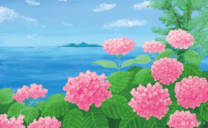 青く広がる海と鮮やかな紫陽花の花が織りなす風景は、どこか懐かしく穏やかな時間を感じさせてくれるような気がして描いてみました。ご覧いただいた方の心に、やさしい安らぎがそっと広がりますように・・・!