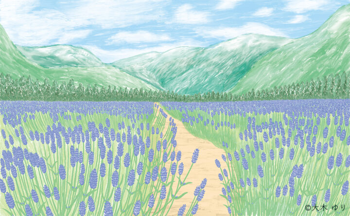 一面に広がる架空のラベンダー畑を描きました。日頃、散歩道の中で見かけるラベンダーはこのような壮大さはありませんが、ふわりと漂う優しい香りは、心がすっと落ち着きます。