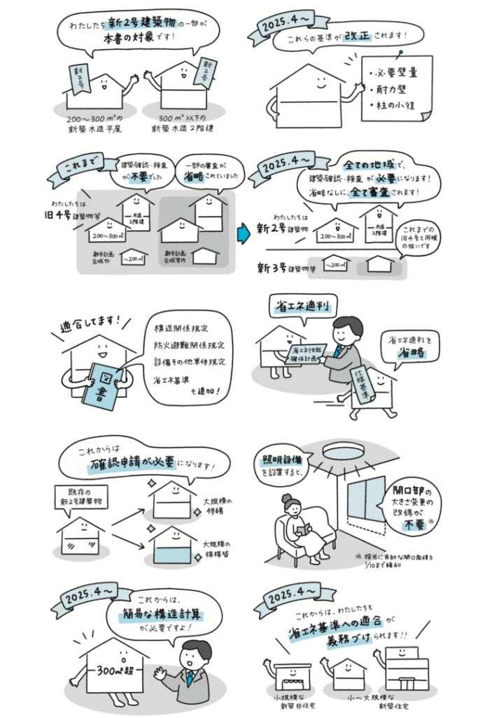 文章だけでは理解しづらい内容を解説するとともに、工務店や設計者などに対して難しすぎる印象を与えないよう、かわいらしさのあるイラストに仕上げました。