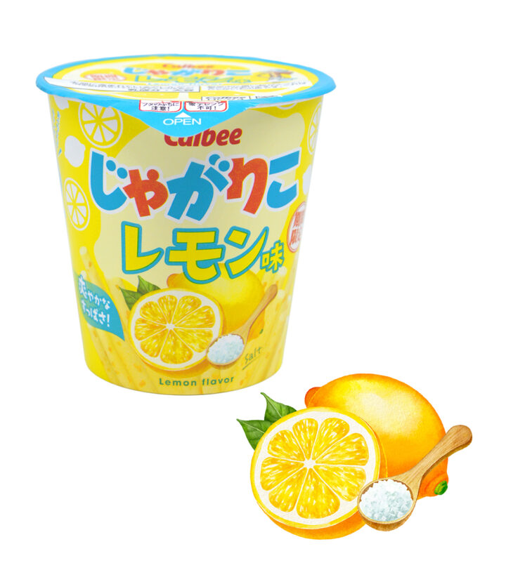 「Calbee じゃがりこ レモン味」のパッケージにて、レモンと塩のイラストを担当させていただきました。透明水彩で、明るく美味しそうに見えるよう意識して制作。販売期間は2024年7月下旬~8月末頃。イオン系列店舗で限定販売されていました。