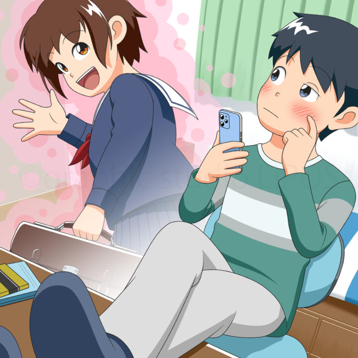 片思いの女子生徒を思い浮かべながら、スマホを手にして思い悩む中学生男子の姿を描いたイラストです。