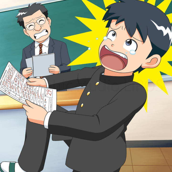 そんなオーバーともいえる男子生徒の様子に、答案を返している先生も思わず苦笑い…という教室での一コマを表現しました。