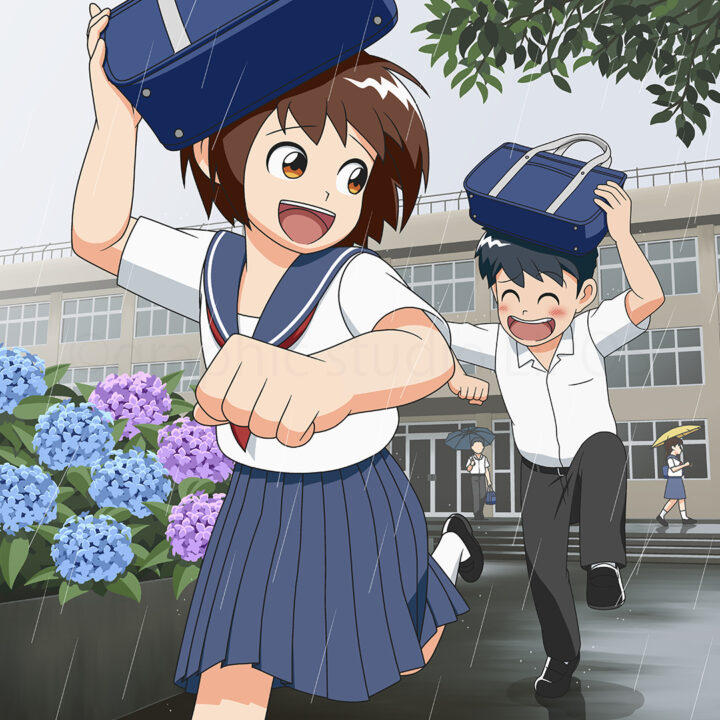 特に男子生徒は思いがけず片思いの女子生徒と一緒に帰ることができて、内心は「雨に感謝!」…というイラストです。