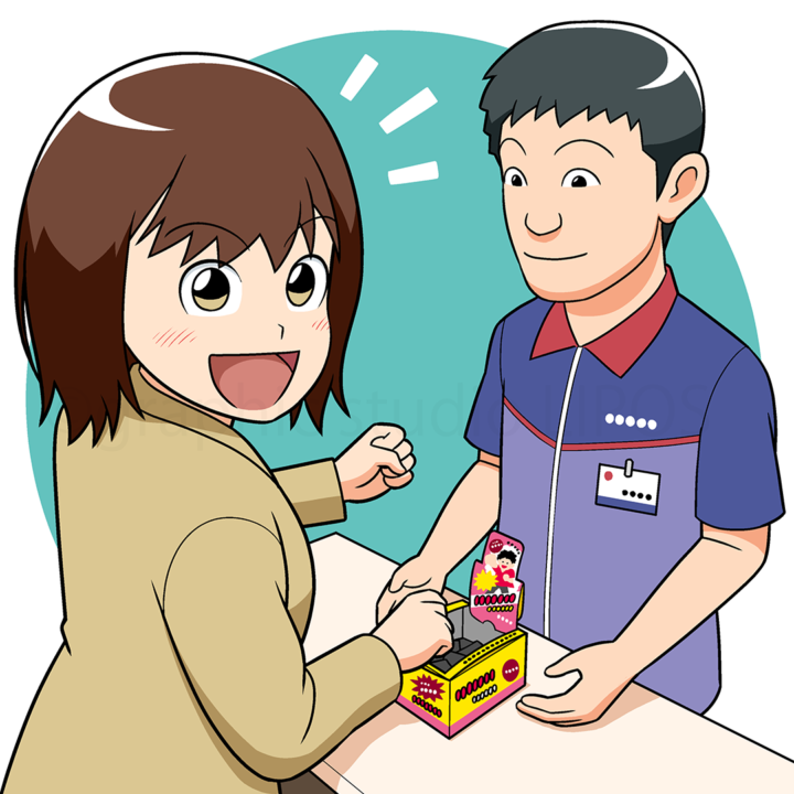 メインイラストは、コンビニのカウンターでくじを引こうとしている場面。