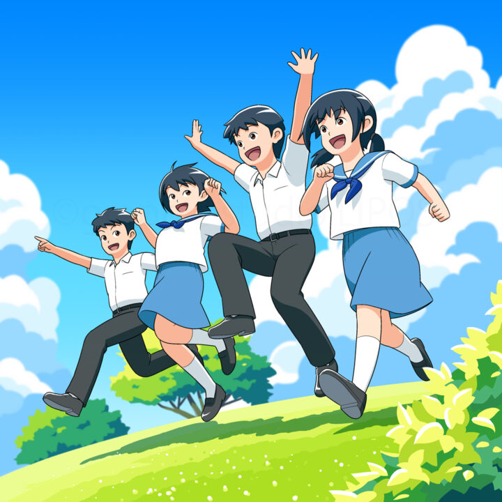 教育関連の教材や広告などで使用するものと想定し、丘の高台から駆け下りる4人の高校生を描いたイラストを作画しました。
