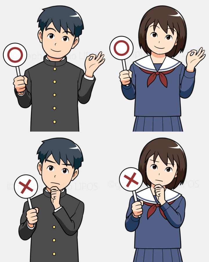 マルとバツの札を持った男女の学生の素材イラストです。