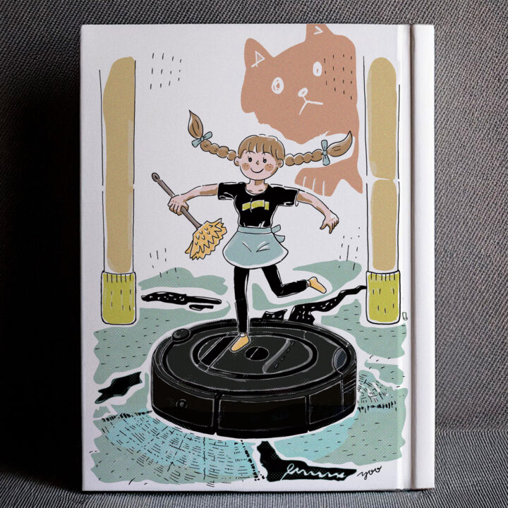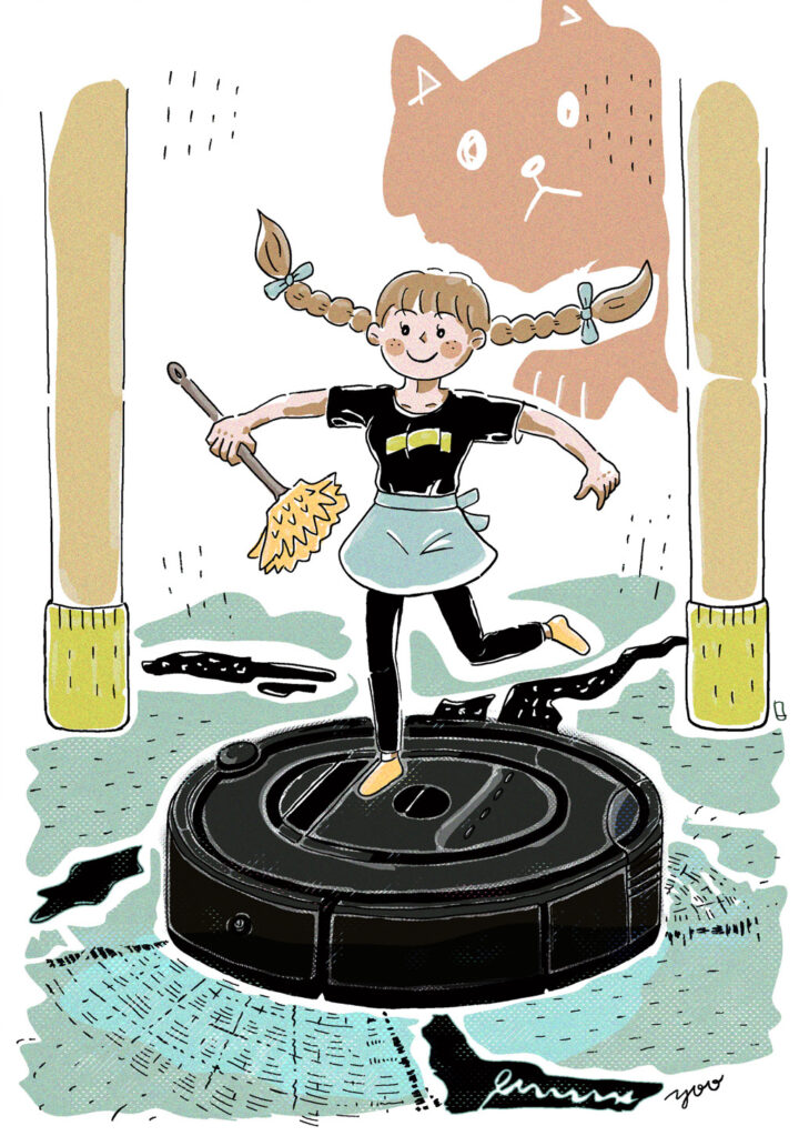 —But enough of that grown-up talk. Today, as always, Roomba is faithfully circling and whirring away, this time with a tiny “cleaning squad girl” riding proudly on top, broom in hand.