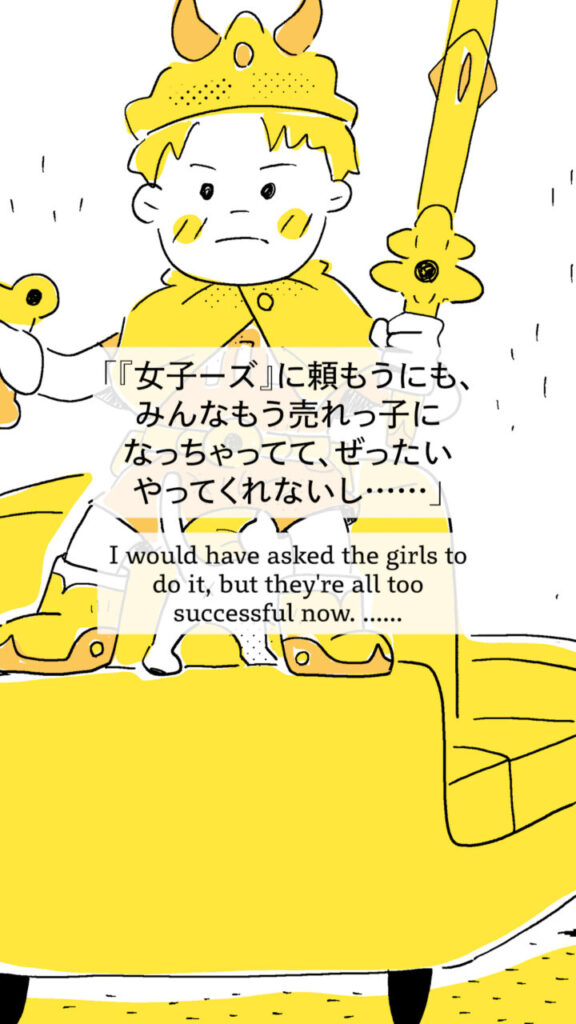B: “What!? Then what are we supposed to do from now on? I mean, world peace and all—what if monsters start attacking!?” “We could ask Joshizu, but they’ve all become huge stars already. There’s no way they’d come back and do it……”