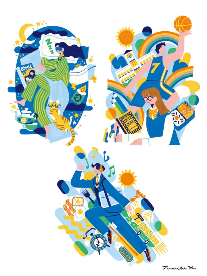 アクリル絵具で塗ったような温かみのある質感でポップで楽しいイラストに仕上げました。
