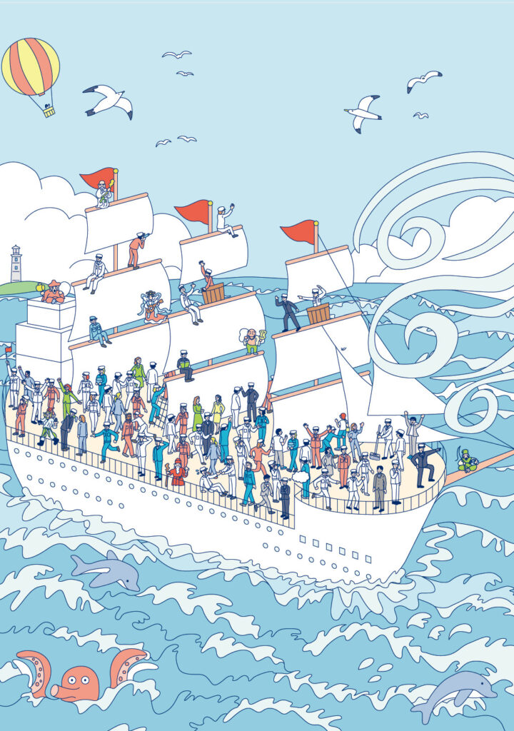 ノアの方舟をモチーフに描いたイラストです🚢 荒波の中を進む、希望に満ちた船の様子を賑やかに表現しました B3サイズのポスターでがデザインで追加されています。