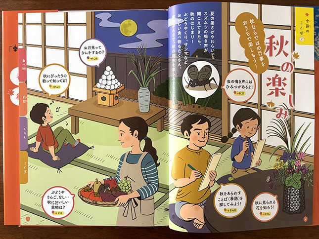 様々な秋の行事や食事、植物などなど、沢山のカットを描きました。