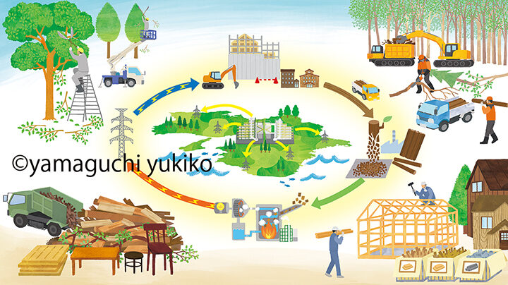 色々な木材から作るグリーン電気 / ノベルティ用イラスト