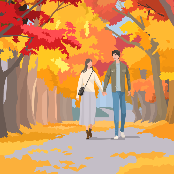 紅葉のトンネルを、穏やかに手を取り合って歩く二人。秋の深まりを感じさせるロマンチックな光景です。
